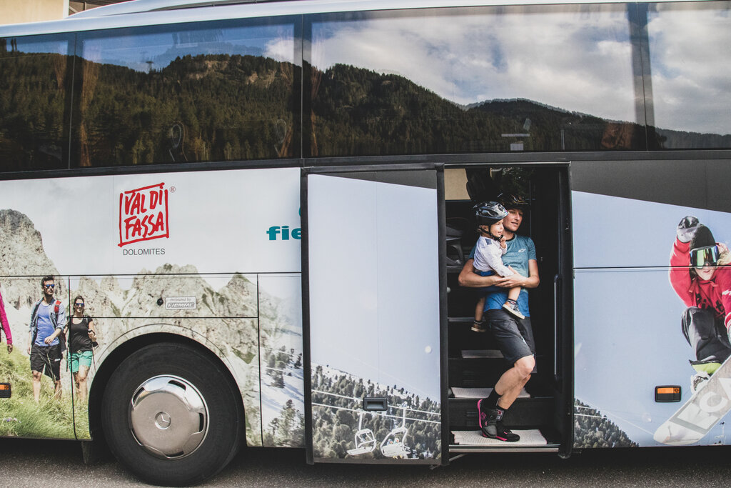Ein Bus bringt die Radfahrer bequem wieder in das Val di Fassa zurück.