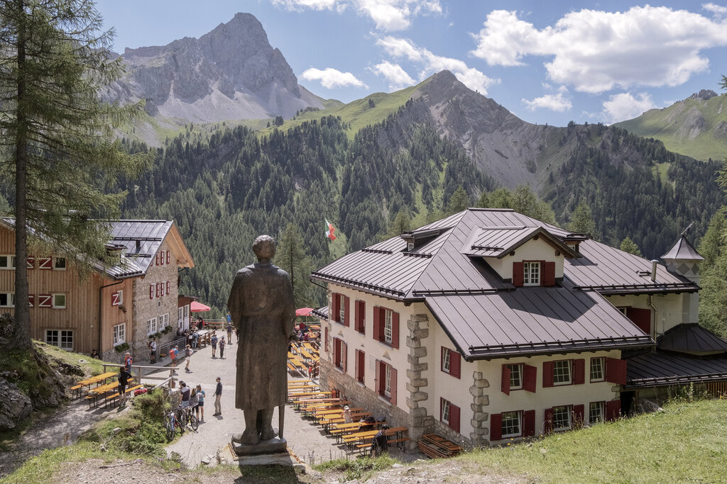 Das Contrin Tal lädt dazu ein, es langsam zu durchqueren, sich in der Sonne auszuruhen und Geschichten zu erfinden - inspiriert von den zauberhaften Bergsilhouetten, die so nah erscheinen, dass man sie fast berühren kann. Über dem Tal thronen die Contrin Hütte und, etwas höher gelegen, die Contrin Alm. Im Rücken erhebt sich die Sellagruppe, links die Marmolada, rechts der "Colac". In der Talmitte begleitet der "Ruf de Contrin" Bach den Weg. Geröllhänge, Lärchen und weite Almwiesen prägen die Landschaft - ein perfekter Ort, um das Panorama auf den majestätischen Sassolungo zu genießen. Während des Ersten Weltkriegs war der Contrin ein wichtiger österreichischer Militärstützpunkt: Entlang des Weges sind noch originale Schützengräben und Stellungen zu sehen.