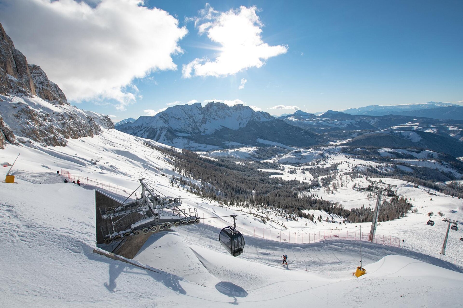 Obwohl eigenständig, ist das Skigebiet Carezza mit dem Skibus bestens an Vigo und Pozza di Fassa, Obereggen und sogar an die Seiser Alm angebunden - und öffnet so Horizonte zu den benachbarten Tälern.