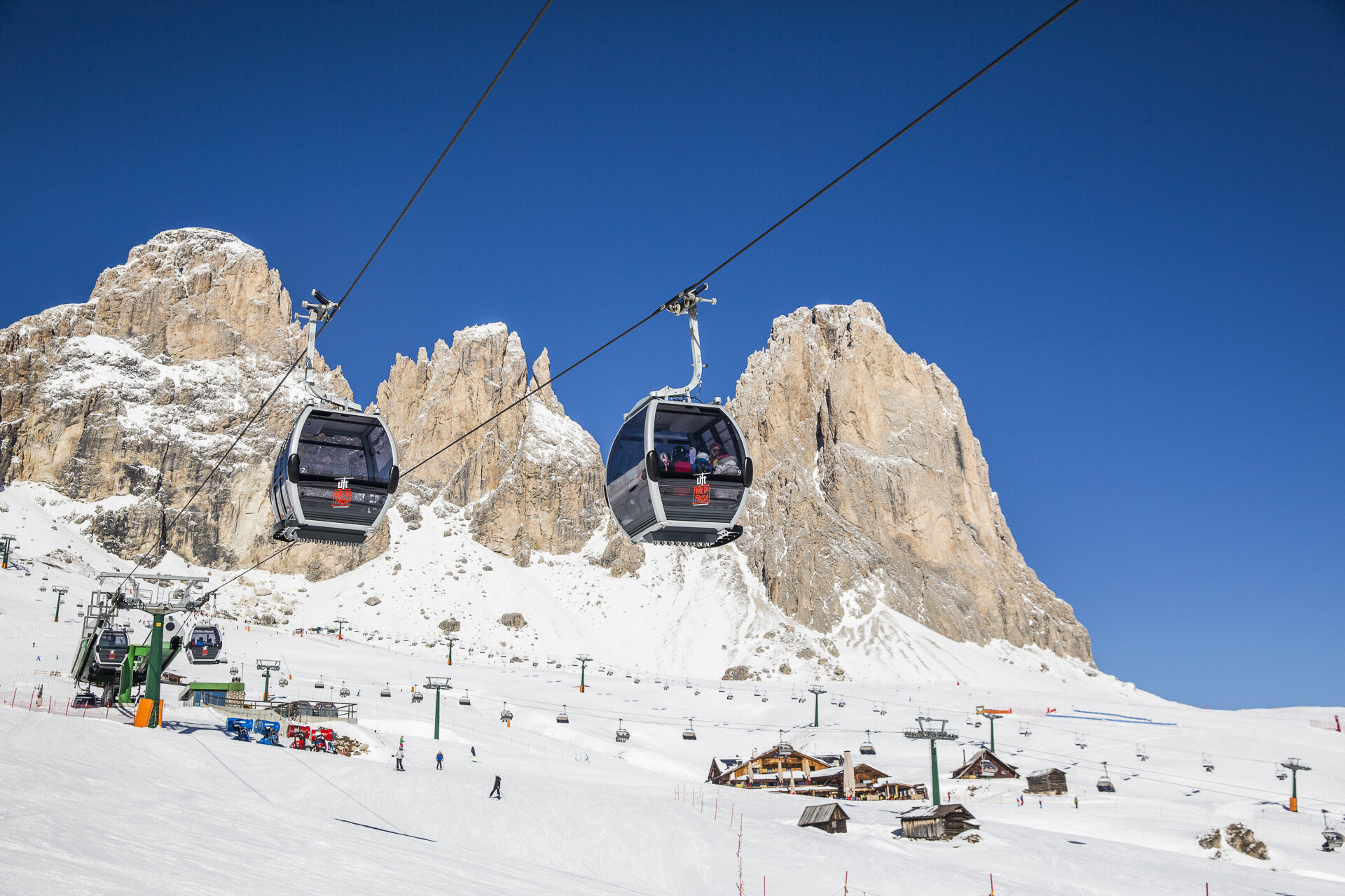 Kilometer für Kilometer entfaltet sich ein neues Abenteuer, während der Blick über die Gipfel schweift: blaue Pisten für entspanntes Skifahren, schnelle, flüssige rote Abfahrten, anspruchsvolle schwarze Wände und endlose Abfahrten bis ins Tal. Vom Pordoijoch bringt Sie die Seilbahn hinauf zum Sass Pordoi, der berühmten Terrasse der Dolomiten. Auf 2.950 m ist dies der höchste Punkt der Tour, mit einem atemberaubenden 360°-Panorama - und dem Blick schon auf die nächste Abfahrt.