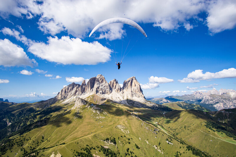Die eigene Kappe in den schönsten Bergen der Welt im Fassatal aufzuziehen, ist ein unvergessliches Erlebnis. Über die Wolken steigen, den Plattkofel, den Langkofel und den Rosengarten überfliegen oder sogar auf der Marmolata landen - all das ist dank der präzisen Kenntnis des Geländes und der Windsysteme sowie der Expertise erfahrener Profis möglich, die ihr Wissen mit Enthusiasten aus der ganzen Welt teilen. Es gibt viele Start- und Landeplätze in den Dolomiten des Fassatals, doch die beliebtesten sind der Col Rodella oberhalb von Campitello und das Belvedere von Canazei - zwei spektakuläre Panoramaspots. Besonders von Ende September bis Anfang Oktober herrschen hier dank eines einzigartigen Mikroklimas, das durch Hochdruckbedingungen begünstigt wird, optimale Flugbedingungen.